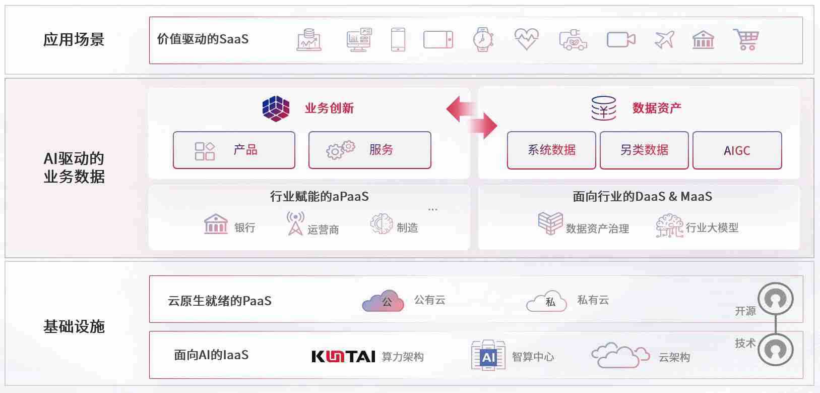 数字时代,,围绕企业数字化转型的关键要素,,,ok钱包数码开创性的提出数云融合战略和技术体系框架,,着力在云原生、、、数字原生、、AI原生和信创产业上架构产品和服务能力,,,,为处在不同数字化转型阶段的快消零售、、、汽车、、、金融、、医疗、、、政企、、教育、、、运营商等行业客户提供泛在的敏捷IT能力和融合的数据驱动能力,,构建跨界融合创新的数字业务场景和新业务模式,,,,助力企业级客户建立面向未来的核心能力和竞争优势,,全面推动社会的数字化、、、、智能化转型升级。。