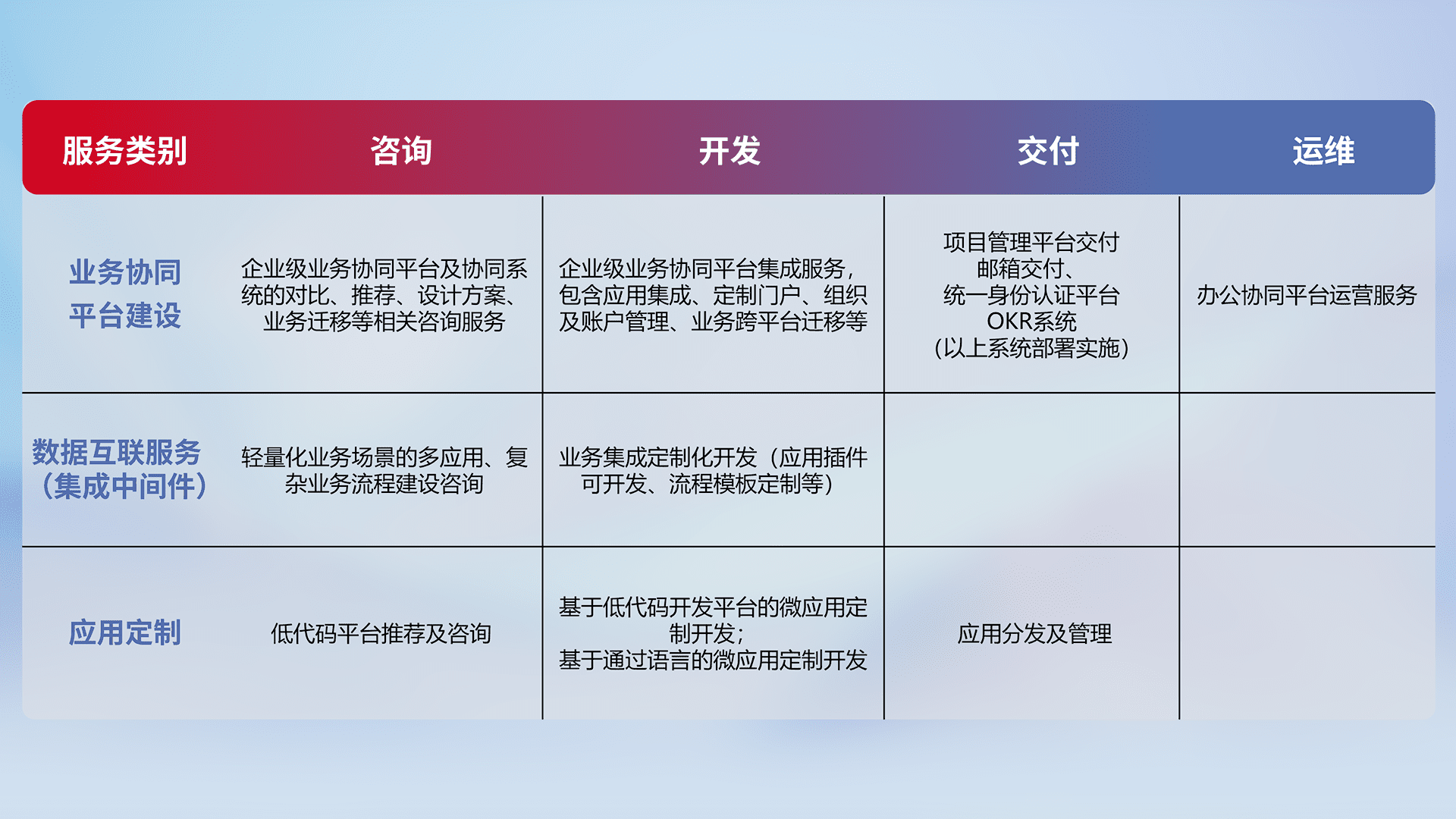针对钉钉、、、企微、、、IDaas等平台级产品提供产品的规划、、、、方案、、交付、、、、定制化开发等服务,,,实现如统一协同办公、、智能客户服务、、、、混合会议管理、、、智能数据查询、、、等业务场景,,实现数字化转型。。。。