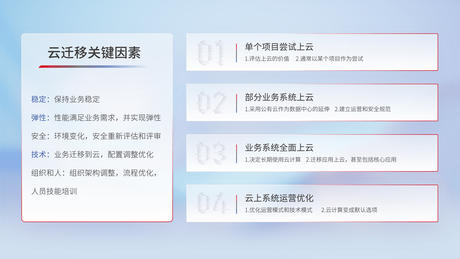 结合实际业务,,,从规划设计、、云平台选型、、、、云原生改造、、数据迁移、、、、集成交付,,,迁移全过程为客户识别最佳上云路径,,,,做好风险识别管理,,,,设计网络架构、、、、身份权限、、、、安全审计合规、、、操作审计、、、日志审计、、监控告警策略、、、、多站点容灾设计等,,对云上基础设施进行整体规划,,提升IT治理水平,,,以满足弹性、、、高可用、、、高性能的需求。。。。
