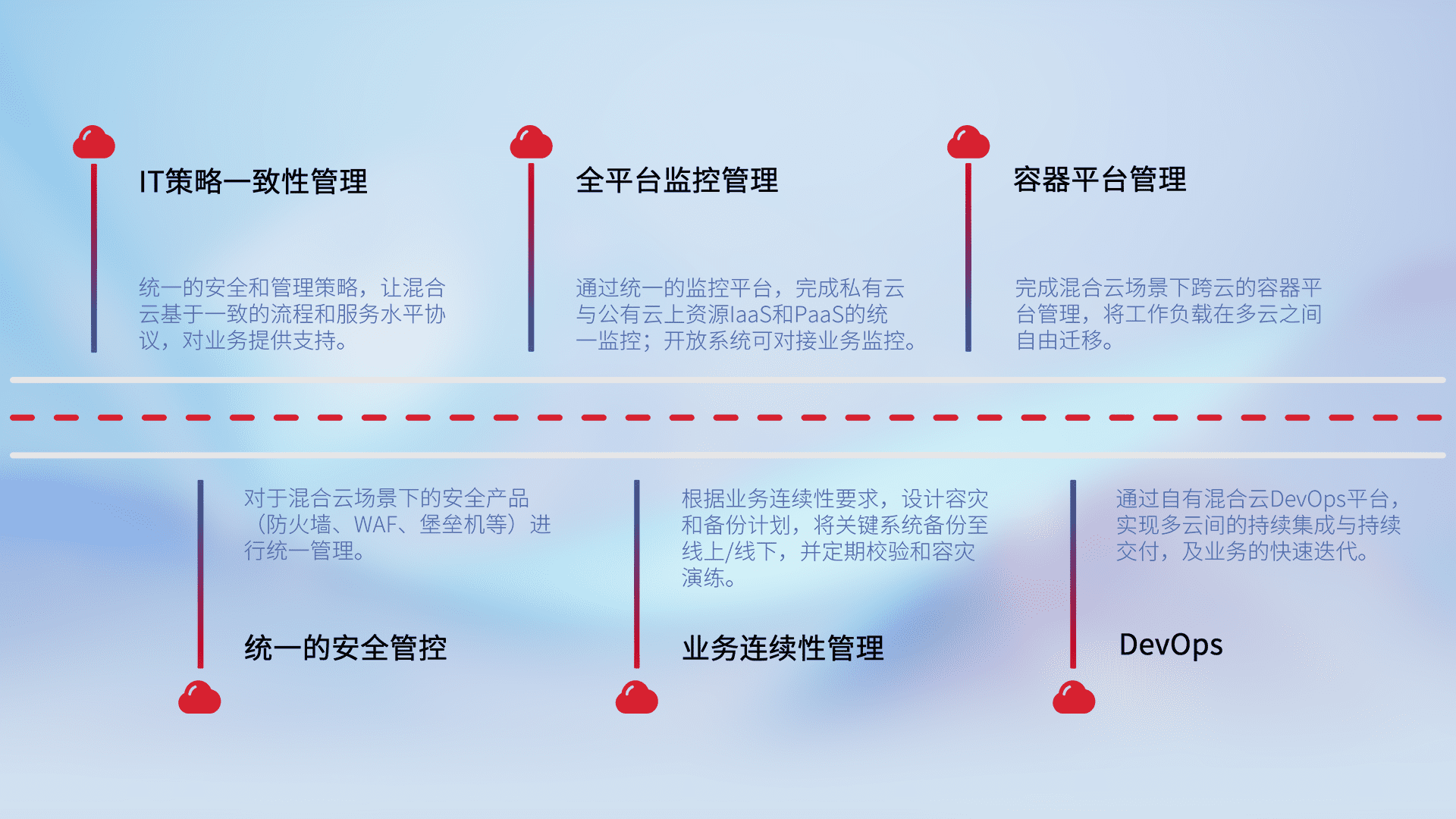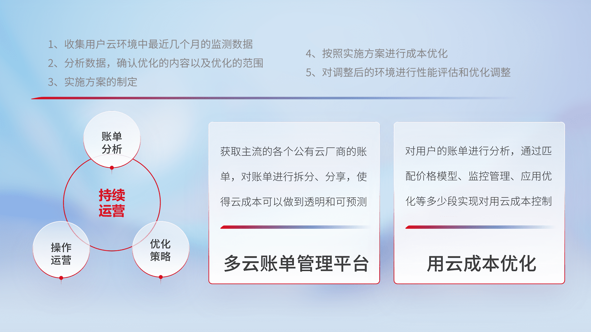 通过多云纳管,,,以统一的资源数据模型把客户的云资源进行抽象和封装,,进而实现对多云资源的统一操作,,,保障云资源管理的可靠性、、、、稳定性与可用性。。。。量身定制化运维内容,,,配置、、开发运维、、、、补丁管理、、、、备份、、、、监控、、、、认证和访问管理、、、、审计和日常巡检等,,,保障在用云过程中的可靠度,,稳定度以及高可用率。。。